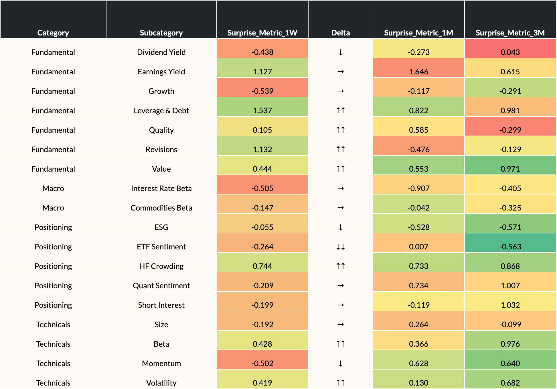 Our “Surprise Metric” reveals factor movements outside of their historical return distributions for different horizons (Surprise 1W, 1M, 3M columns below). Values above 1 (below -1) standard deviation suggest outsized strength (weakness) relative to history (data sourced from our open ecosystem of risk model providers).