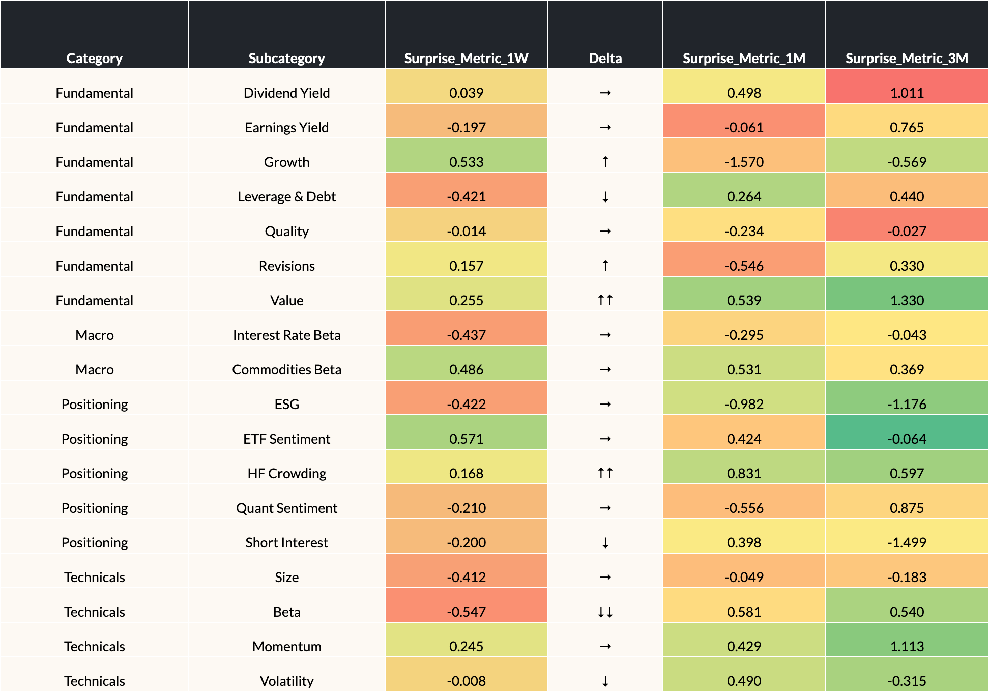 Our “Surprise Metric” reveals factor movements outside of their historical return distributions for different horizons (Surprise 1W, 1M, 3M columns below). Values above 1 (below -1) standard deviation suggest outsized strength (weakness) relative to history (data sourced from our open ecosystem of risk model providers).