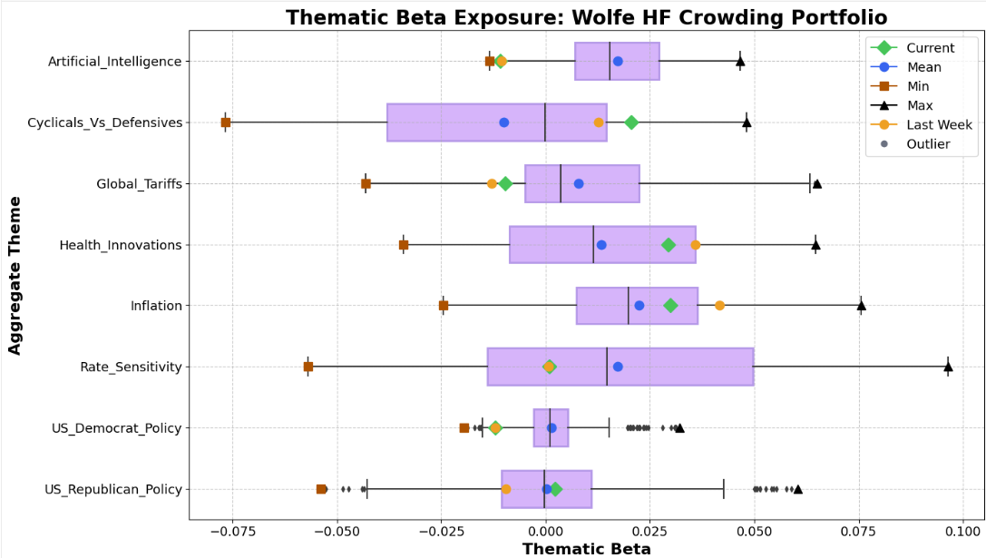 This snapshot reveals thematic hedge fund exposure by measuring the beta of a Wolfe Hedge Fund Crowding factor portfolio to key market themes, calculated from residual return data. Higher beta indicates greater crowding in the theme, while lower beta suggests contrarian or avoided positioning to the theme. Data used for this analysis extends back to Jan 1st, 2024.