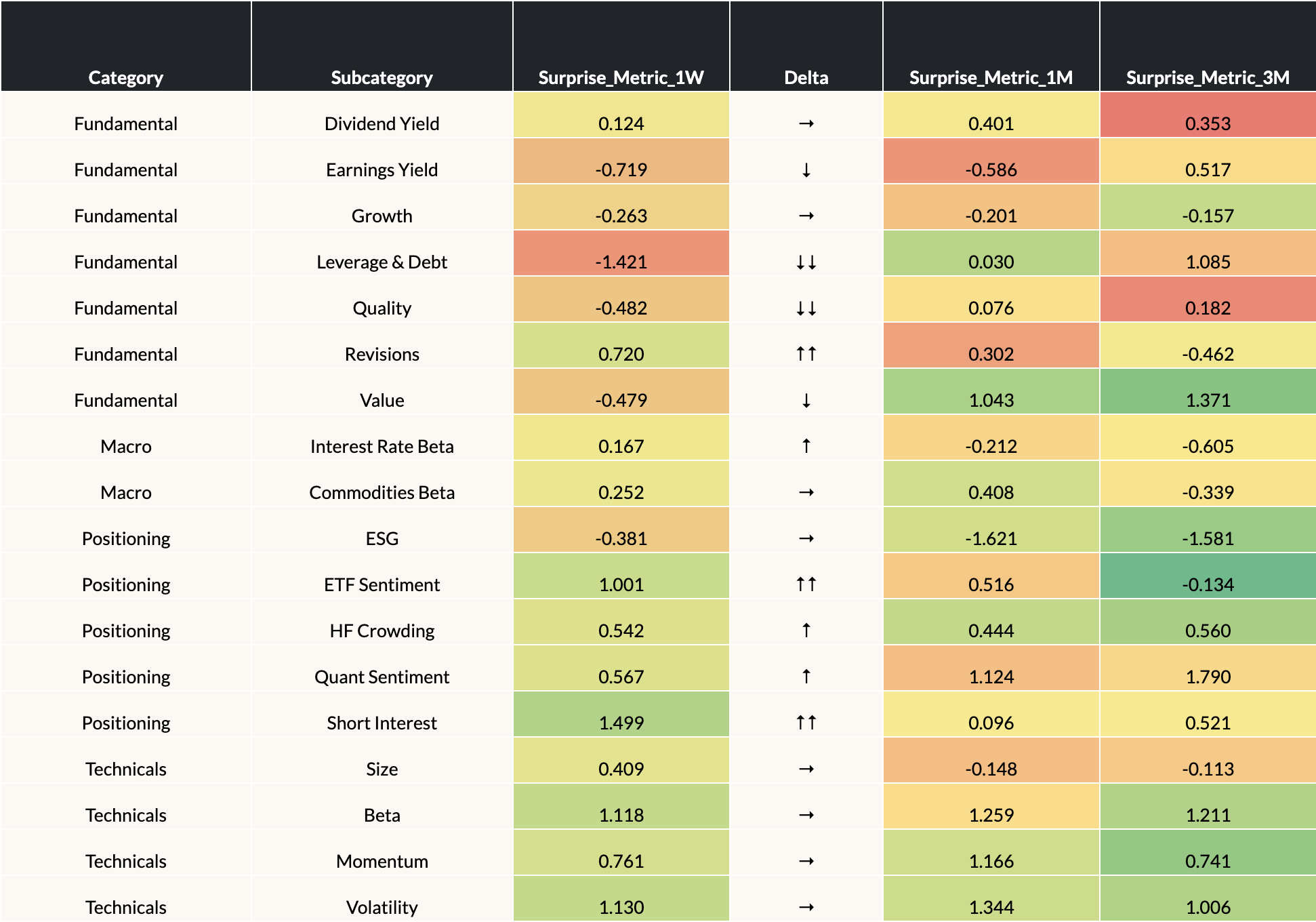Our “Surprise Metric” reveals factor movements outside of their historical return distributions for different horizons (Surprise 1W, 1M, 3M columns below). Values above 1 (below -1) standard deviation suggest outsized strength (weakness) relative to history (data sourced from our open ecosystem of risk model providers).
