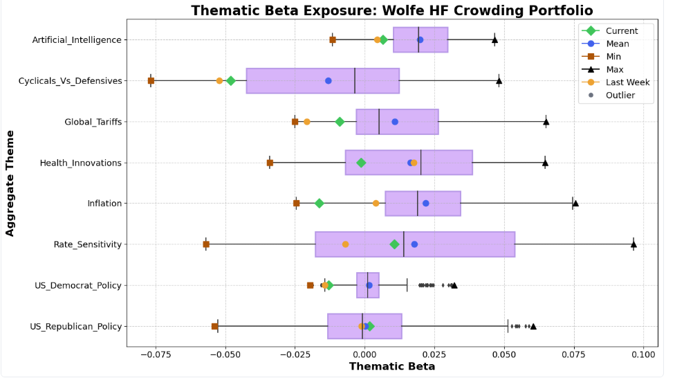This snapshot reveals thematic hedge fund exposure by measuring the beta of a Wolfe Hedge Fund Crowding factor portfolio to key market themes, calculated from residual return data. Higher beta indicates greater crowding in the theme, while lower beta suggests contrarian or avoided positioning to the theme. Data used for this analysis extends back to Jan 1st, 2024.