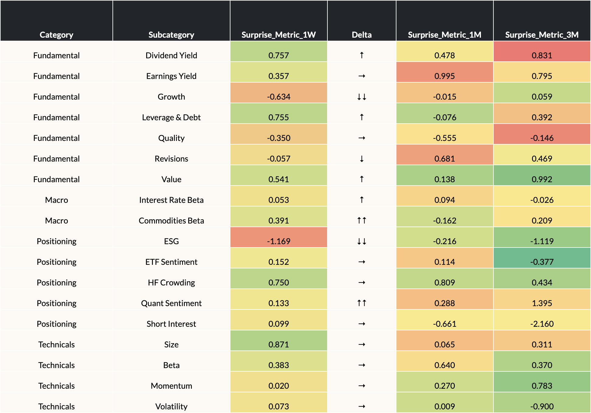 Our “Surprise Metric” reveals factor movements outside of their historical return distributions for different horizons (Surprise 1W, 1M, 3M columns below). Values above 1 (below -1) standard deviation suggest outsized strength (weakness) relative to history (data sourced from our open ecosystem of risk model providers).