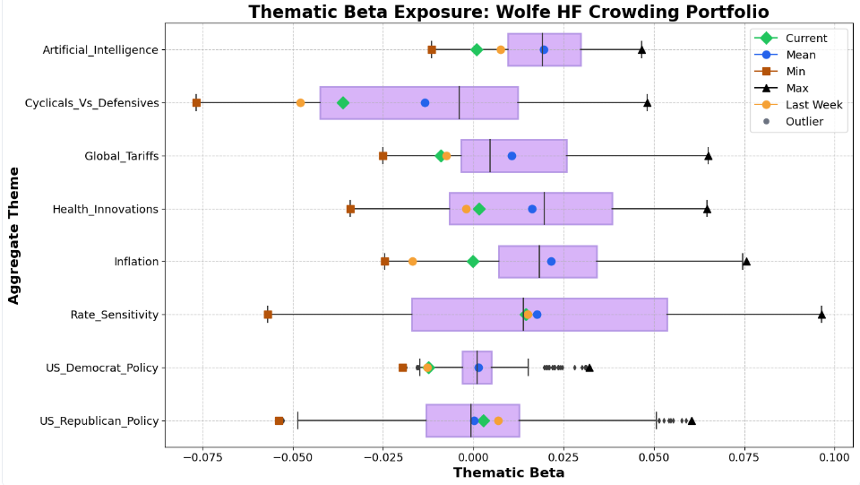 This snapshot reveals thematic hedge fund exposure by measuring the beta of a Wolfe Hedge Fund Crowding factor portfolio to key market themes, calculated from residual return data. Higher beta indicates greater crowding in the theme, while lower beta suggests contrarian or avoided positioning to the theme. Data used for this analysis extends back to Jan 1st, 2024.