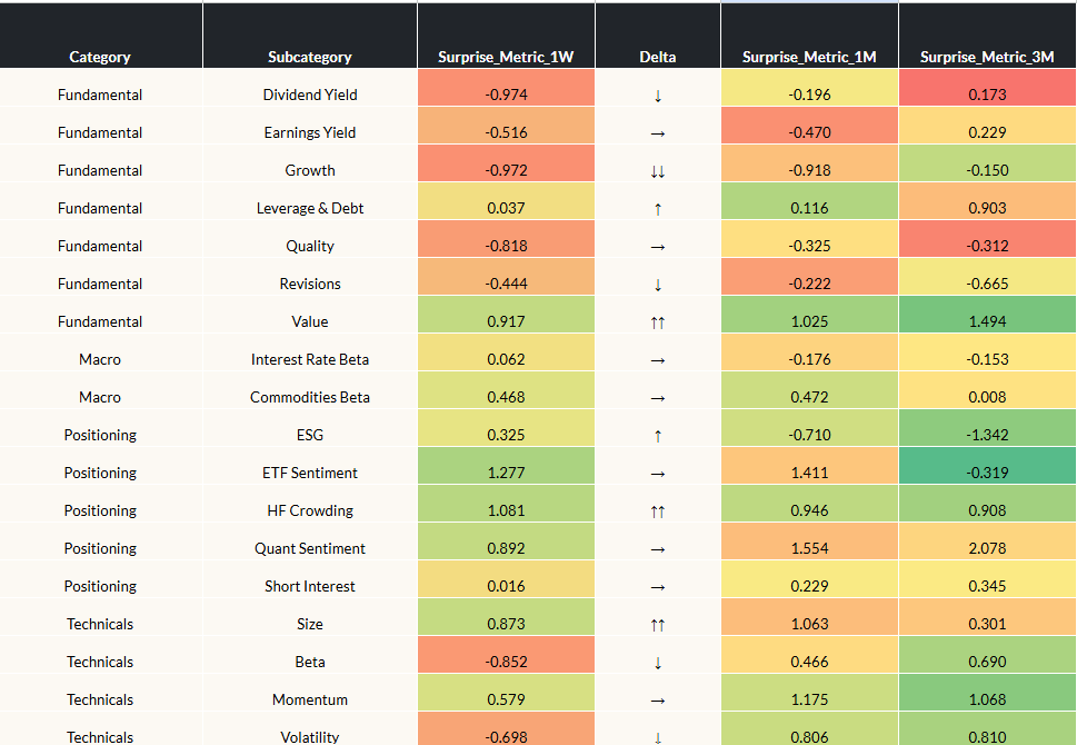 Our “Surprise Metric” reveals factor movements outside of their historical return distributions for different horizons (Surprise 1W, 1M, 3M columns below). Values above 1 (below -1) standard deviation suggest outsized strength (weakness) relative to history (data sourced from our open ecosystem of risk model providers).