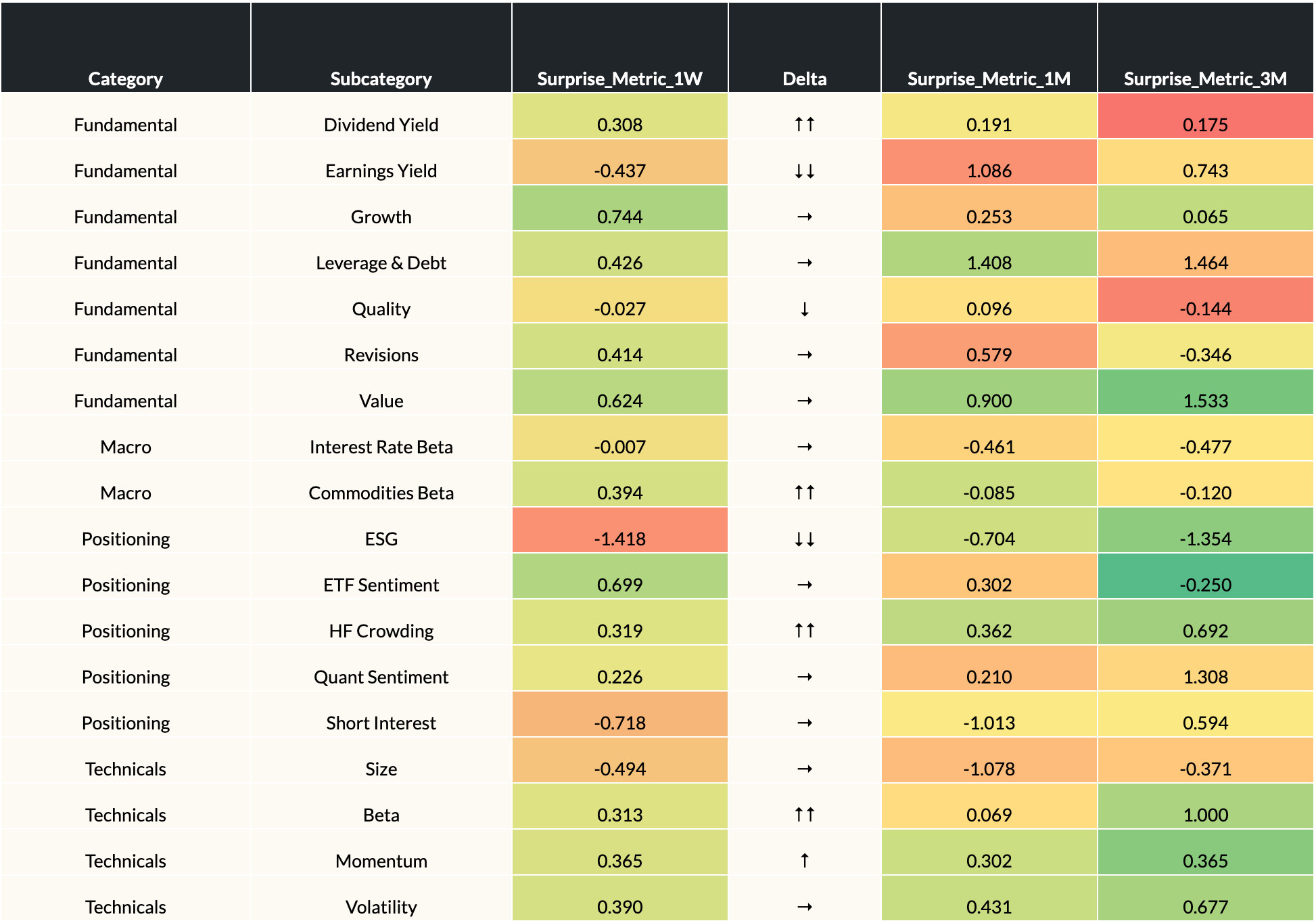 Our “Surprise Metric” reveals factor movements outside of their historical return distributions for different horizons (Surprise 1W, 1M, 3M columns below). Values above 1 (below -1) standard deviation suggest outsized strength (weakness) relative to history (data sourced from our open ecosystem of risk model providers).